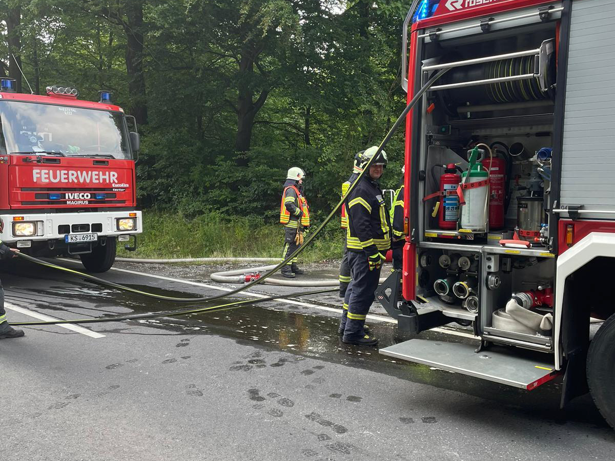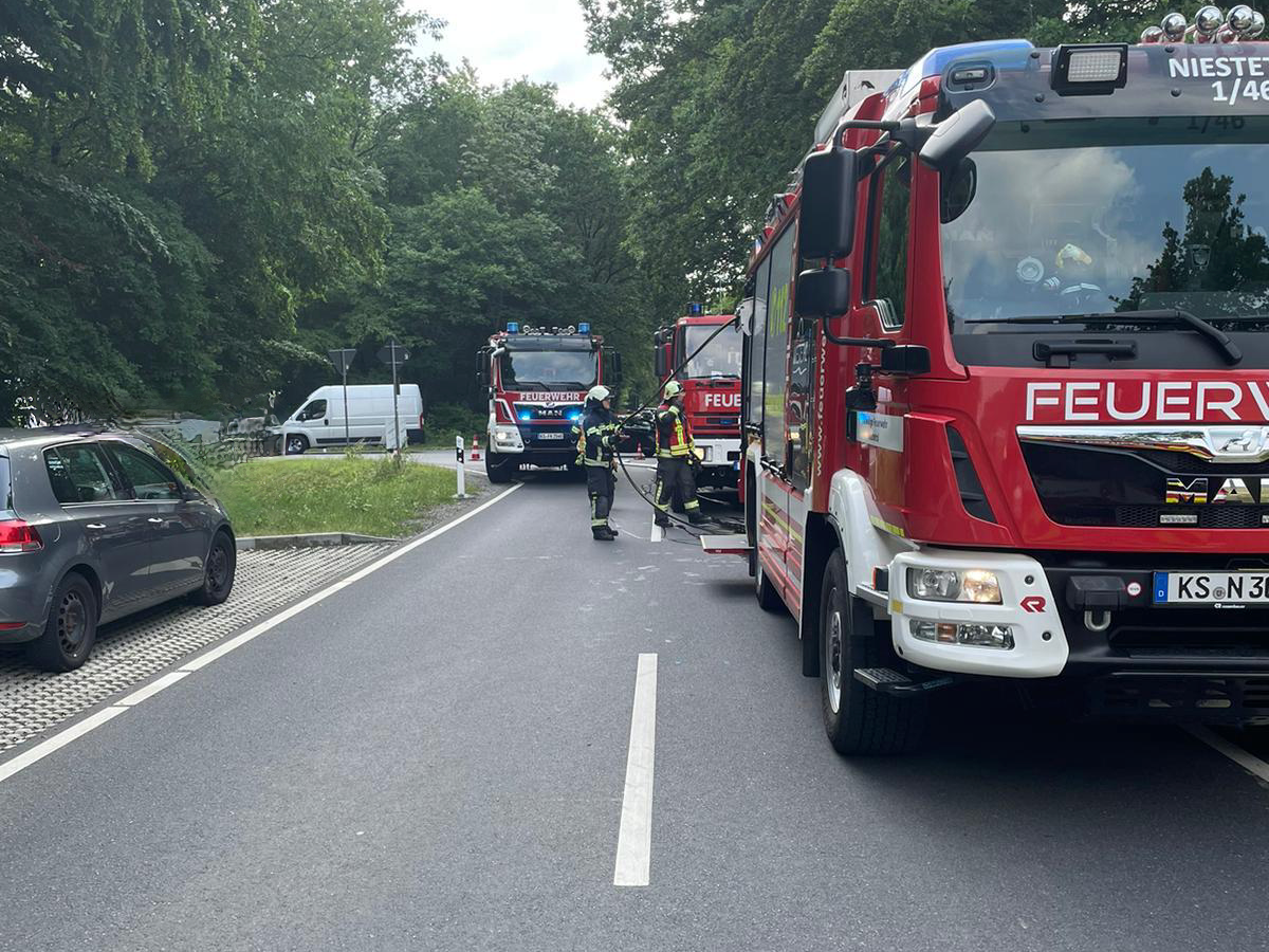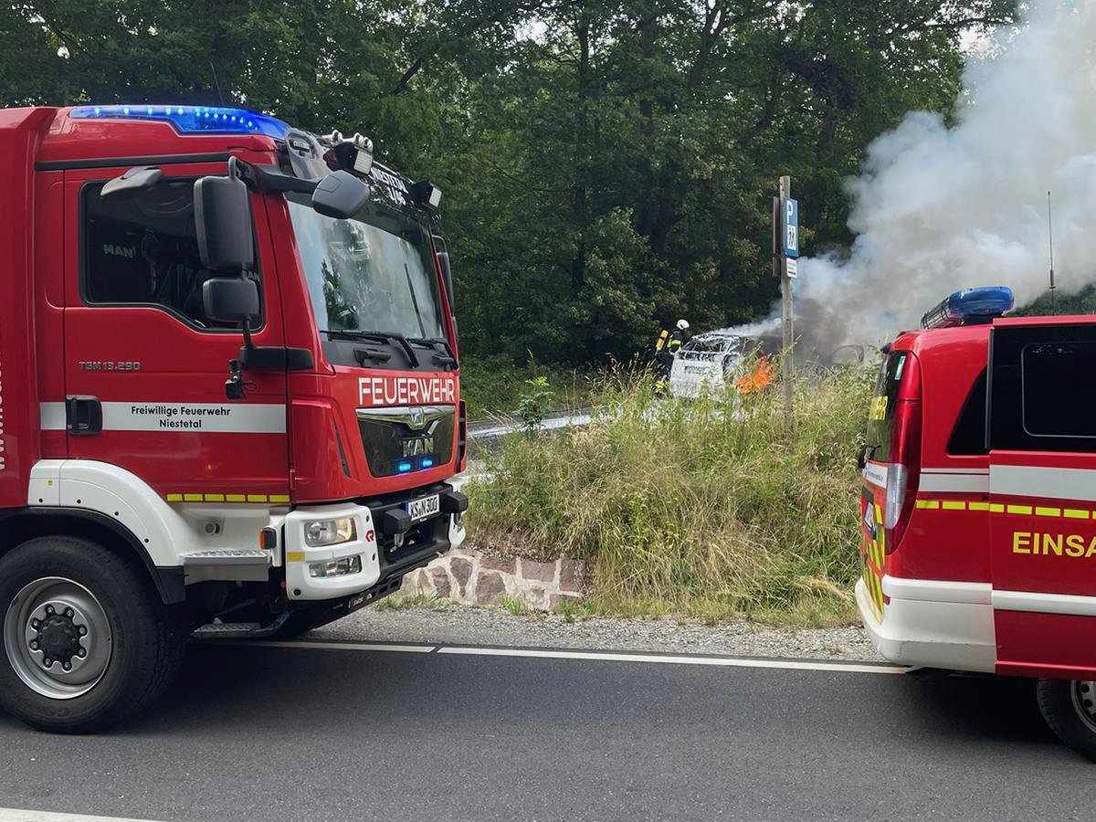 Am Montagnachmittag wurde die Feuerwehr Kaufungen zur Unterstützung der Kameraden aus Niestetal auf die K4 alarmiert. Vor Ort kam es zu einem PKW-Brand. Umgehend wurden die Löschmaßnahmen eingeleitet und das Fahrzeug im weiteren Verlauf mit Schaum benetzt, um an alle Glutnester zu gelangen. Die Insassen konnten das Fahrzeug rechtzeitig verlassen.