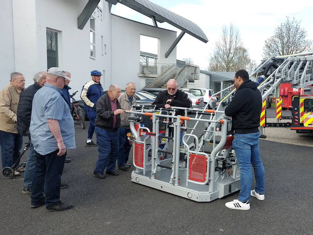 Nach einem Rundgang um das Fahrzeug und die entsprechenden Erklärungen zu den in den Geräteräumen verstauten Gerätschaften und ihre Einsatzmöglichkeiten, wurde selbstverständlich der eigentliche Teil des Fahrzeuges, der Leiterpark mit dem Rettungskorb vorgeführt.