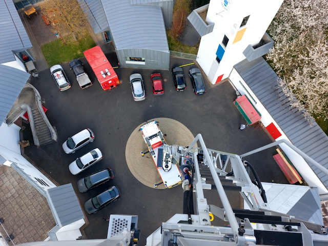 Nach einer „Einweisung“ wurde von einigen Kameraden die Gelegenheit genutzt, die maximale Möglichkeit der Ausfuhr der Leiter in eine Höhe von 30 Metern zu erleben. Sanft fuhr der Korb in die Höhe und nach unter geschaut, kam der Gedanke auf, ob das kleine Fahrgestell nicht kippen könnte!