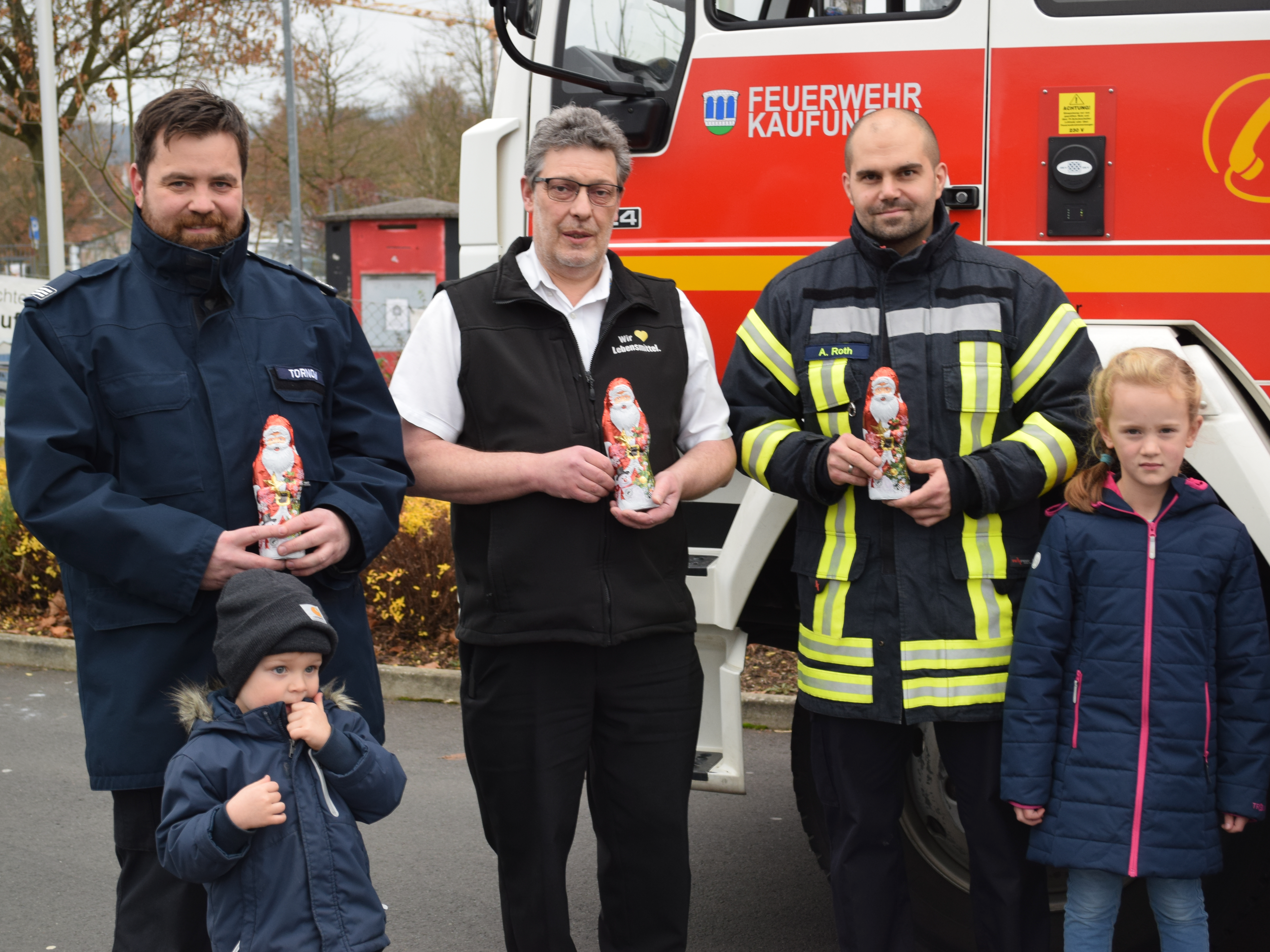 Marktinhaber Thomas Smit überreichte Gemeindekinderfeuerwehrwart Alexander Roth stellvertretend an die Mitglieder der Kinderfeuerwehr, Schokonikoläuse für die geplante Nikolausfeier im Stützpunkt.