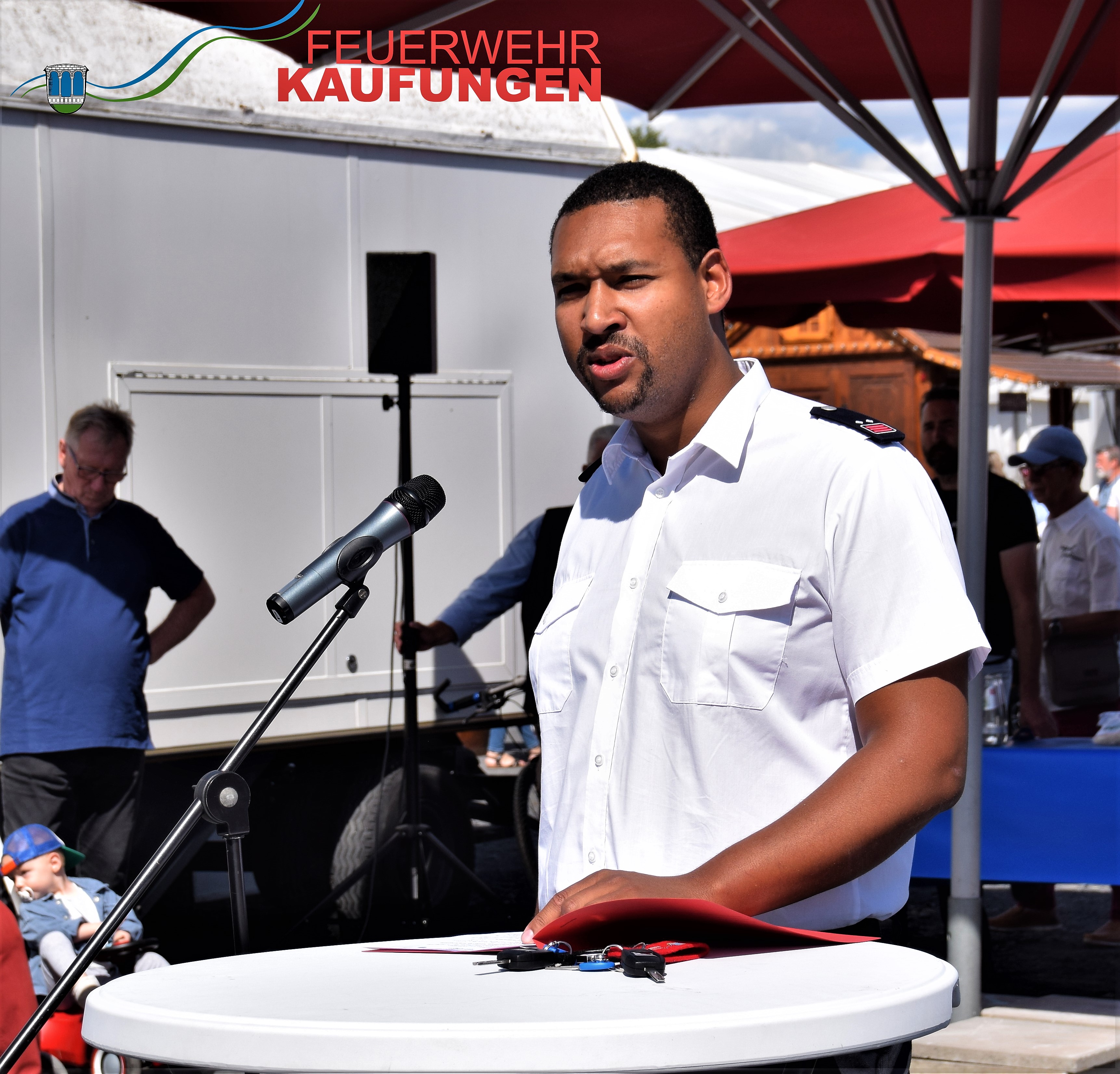 Der stellvertretende Gemeindebrandinspektor Brian Edokpolor begrüßte die anwesenden Gäste im Namen der Feuerwehr Kaufungen und gab einige Erläuterungen zu den neuen Einsatzfahrzeugen mit denen wichtige Lücken im Fuhrpark geschlossen wurden. Edokpolor lud interessierte Gäste im Anschluss an die Fahrzeugübergabe zur Besichtigung der Fahrzeuge ein.