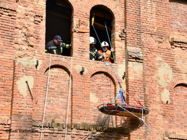 Da es zu dem Dachboden keinen geeigneten Treppenabgang gibt, musste der Patient gesichert gelagert über ein Fenster herabgelassen werden. Das wurde von ausgebildeten Einsatzkräften der Höhenrettung im Gebäude vorbereitet und die Trage mit Seilen am Gebäude abgelassen.