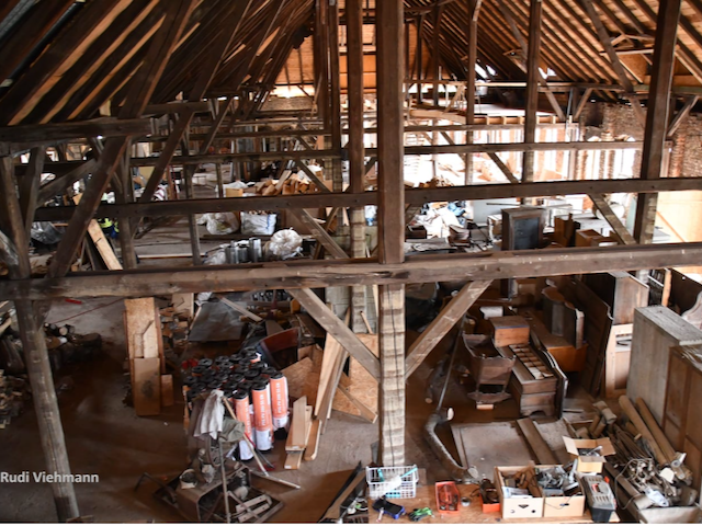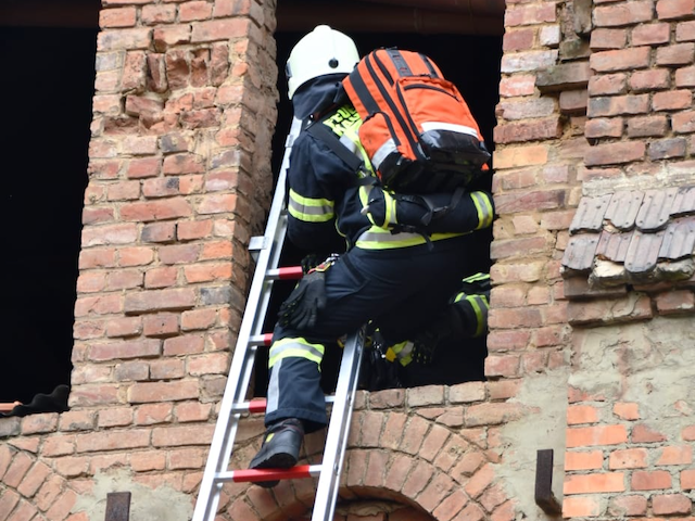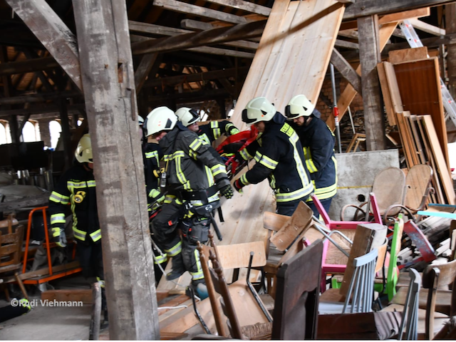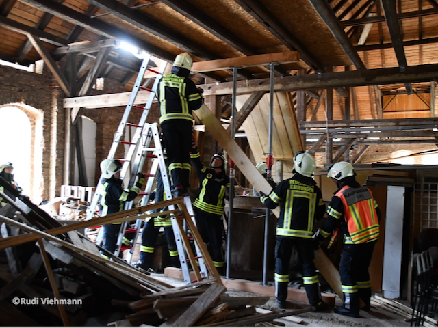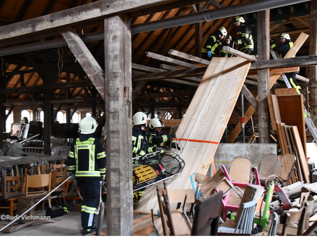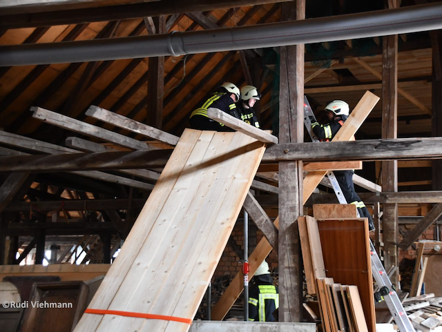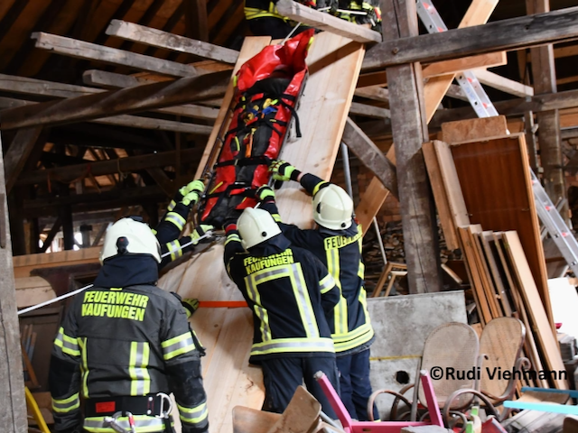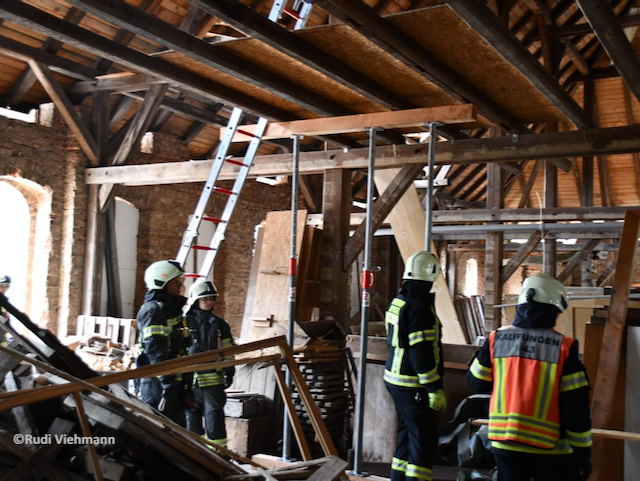 Im hinteren Gebäudeteil war eine Person bei Bauarbeiten auf dem Dachboden des Gebäudes auf einen Zwischenboden gestürzt. Hier war eine patientenschonende Bergung sehr wichtig. Allerdings musste zuvor der Zwischenboden gegen Einstürzen abgesichert werden. Mit Bausprießen und weiterem Abstützmaterial wurde zuerst der Boden gesichert. Dann wurde mit Bauholz eine schiefe Ebene aufgebaut um dem zwischenzeitlich Rückenschonend auf einer Schleifkorbtrage gelagerten Patienten abzulassen.