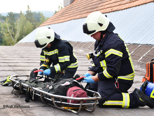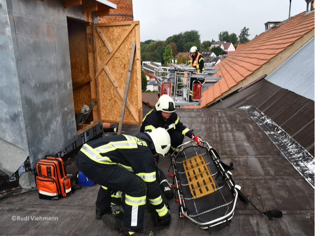 Eine verunfallte Person im Dachbereich, konnte mit Hilfe der Drehleiter über das Dach geborgen und zur weiteren Behandlung dem Rettungsdienst übergeben werden.