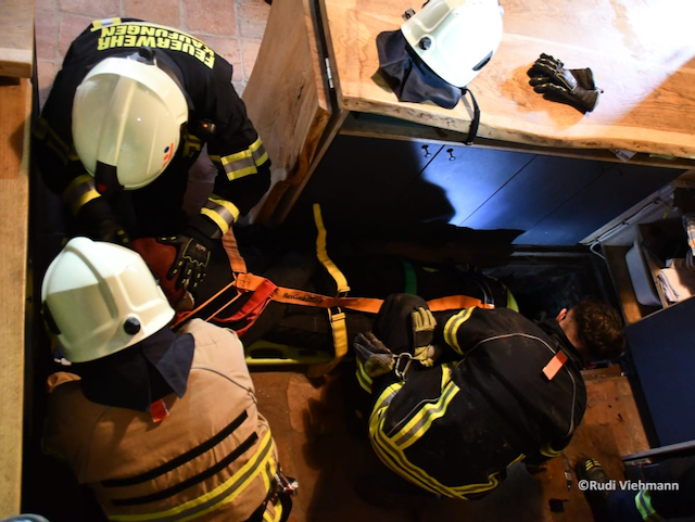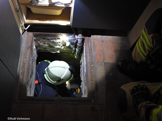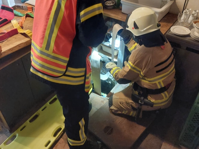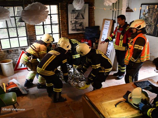 Im vorderen Gebäudeteil war ein Arbeiter bei Wartungsarbeiten in einem Schacht verunfallt. Die Bergung des Patienten gestaltete sich schwierig, da der Schachteinstieg baulich sehr eng war. Mit Hilfe von Feuerwehrschläuchen konnte eine Einsatzkraft den Arbeiter fixieren und weitere Kräfte zogen die Person durch die enge Öffnung nach oben, hier war Improvisation sehr wichtig, denn vorhandene technische Hilfsmittel konnten in dieser Einsatzlage nicht angewandt werden. Nach der Bergung wurde der Patient dem Rettungsdienst übergeben.