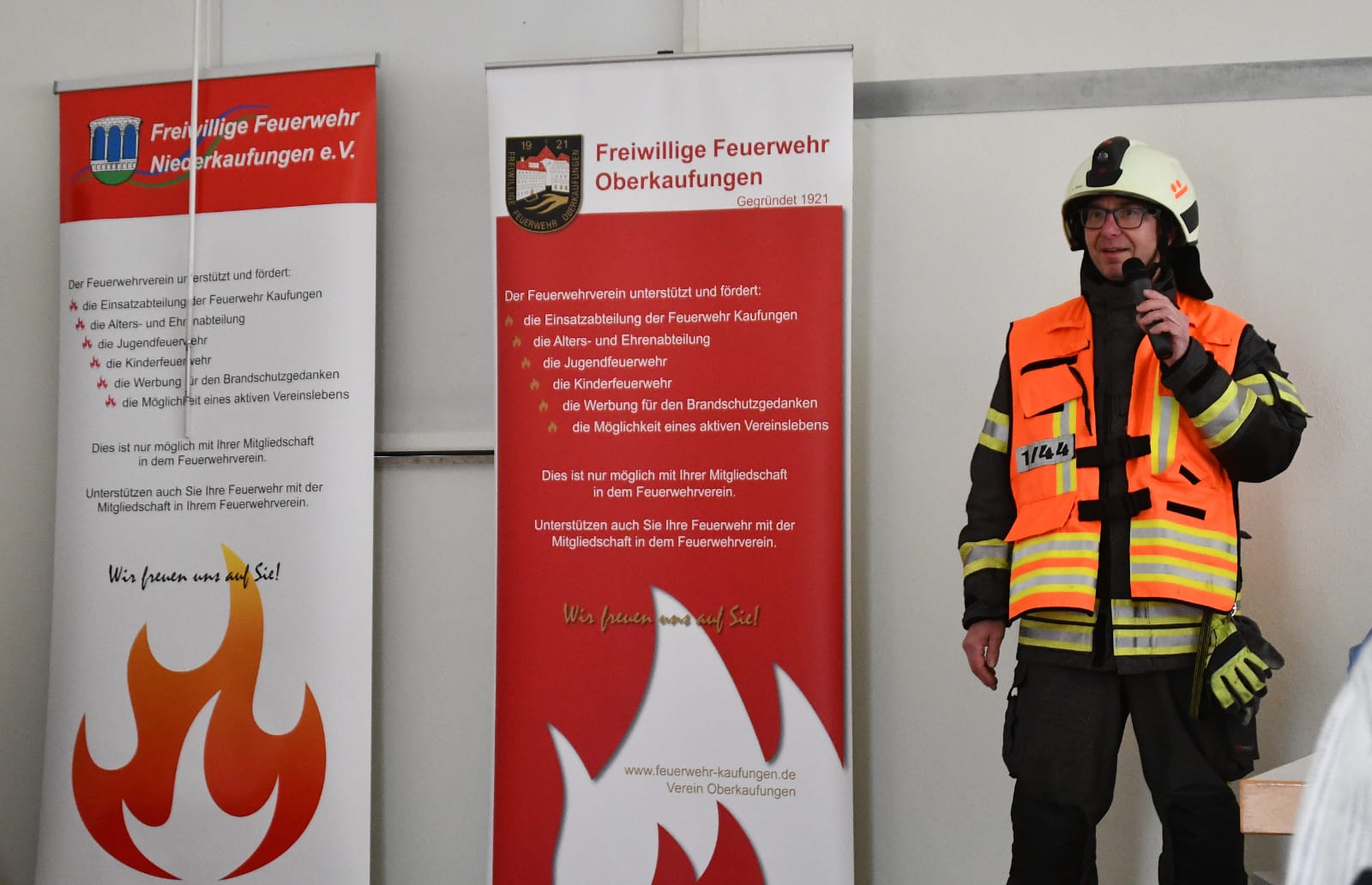 Neben den Vereinsmitgliedern mit Partnern konnten die Vorsitzenden Bürgermeister Arnim Ross, den Oberkaufunger Ehrenvorsitzenden Kamerad Ernst Kilian und den Vorsitzenden des Kreisfeuerwehrverbandes, Kamerad Norbert Damm, begrüßen.