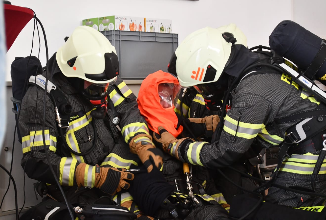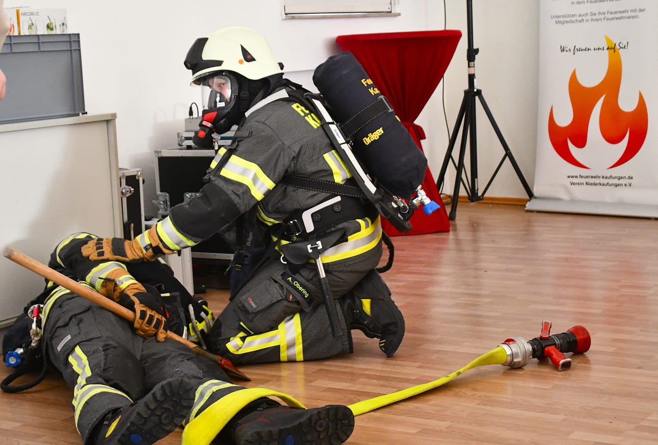 Zu einer Feuerwehrveranstaltung gehört selbstverständlich eine Präsentation der aktiven Abteilung. Dargestellt wurde die Versorgung und Bergung einer unter Atemschutz tätigen Einsatzkraft nach einem medizinischen Notfall. Hier müssen die Einsatzkräfte selbsttätig handeln, um ihren/ihre Kameraden/Kameradin aus der Gefahrenzone zu bringen und dem Rettungsdienst zu übergeben.