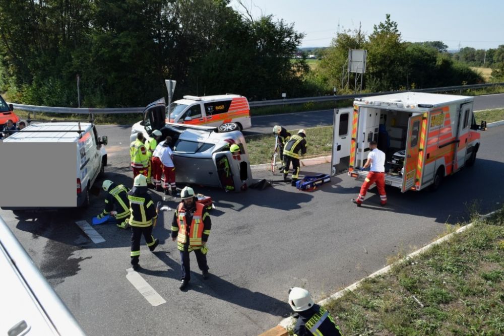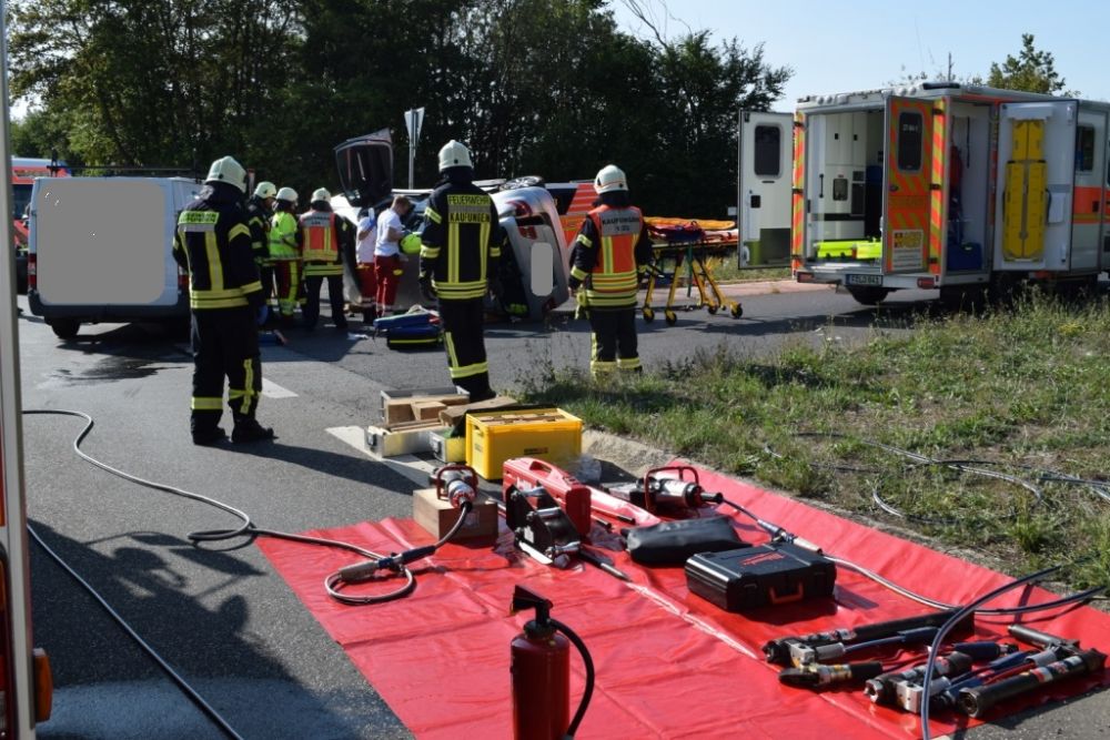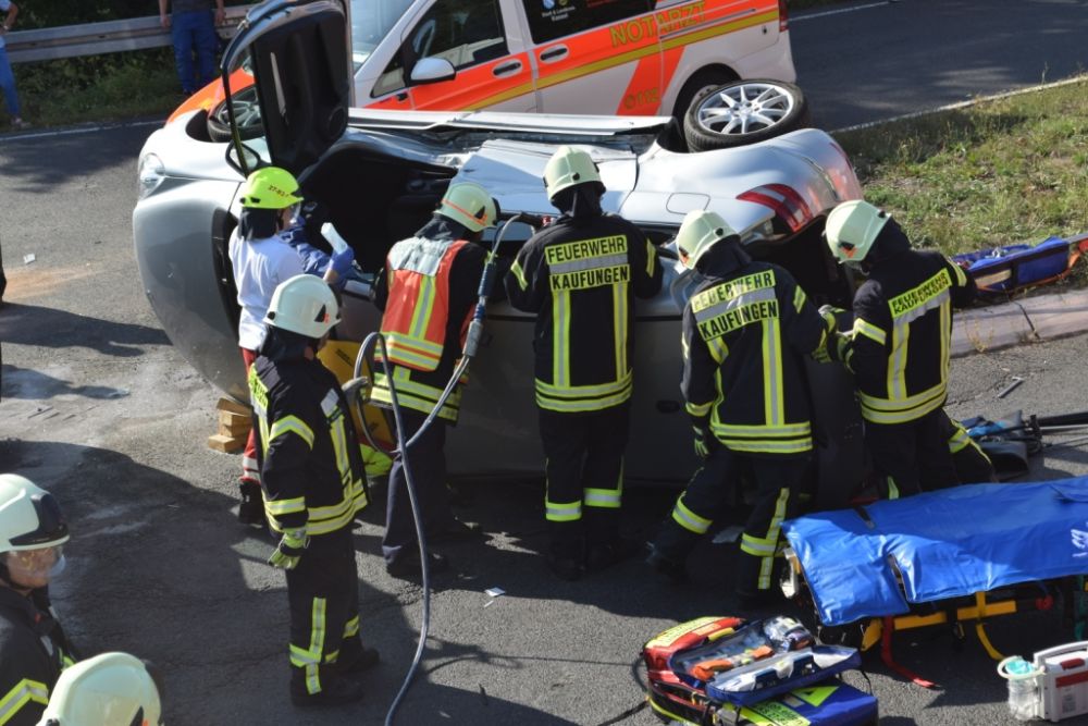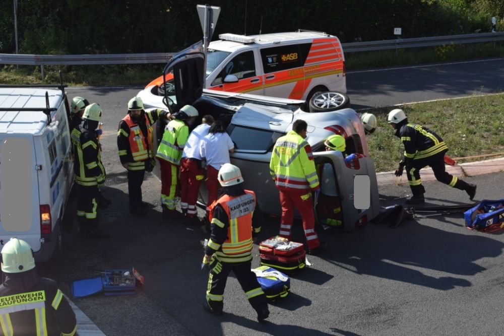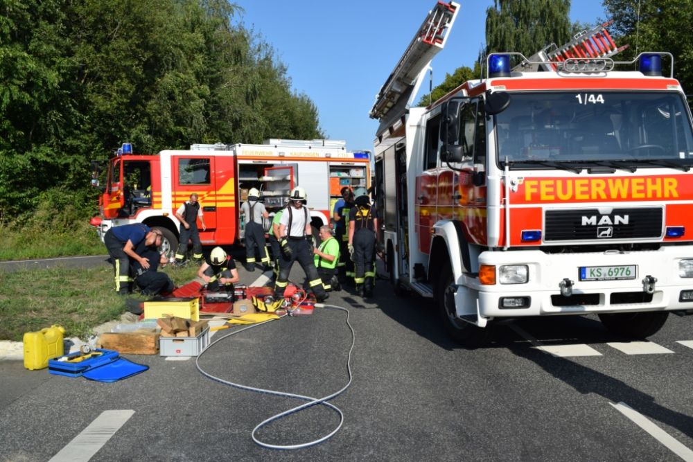 Am Donnerstagnachmittag wurde die Feuerwehr Kaufungen zu einem Verkehrsunfall im Kreuzungsbereich der Abfahrt der B7 Richtung Vollmarshausen alarmiert. Vor Ort waren ein Van und ein Pkw kollidiert. Der Fahrer des PKW der durch den Aufprall auf der Seite lag, wurde im Fahrzeug schwer verletzt. Um Ihn schonend aus dem Pkw retten zu können, wurde in Absprache mit dem Notarzt vor Ort das Dach durch die Feuerwehr abgeklappt. Im Anschluss unterstützte die Feuerwehr bei der schonenden Rettung und streute auslaufende Betriebsstoffe ab.