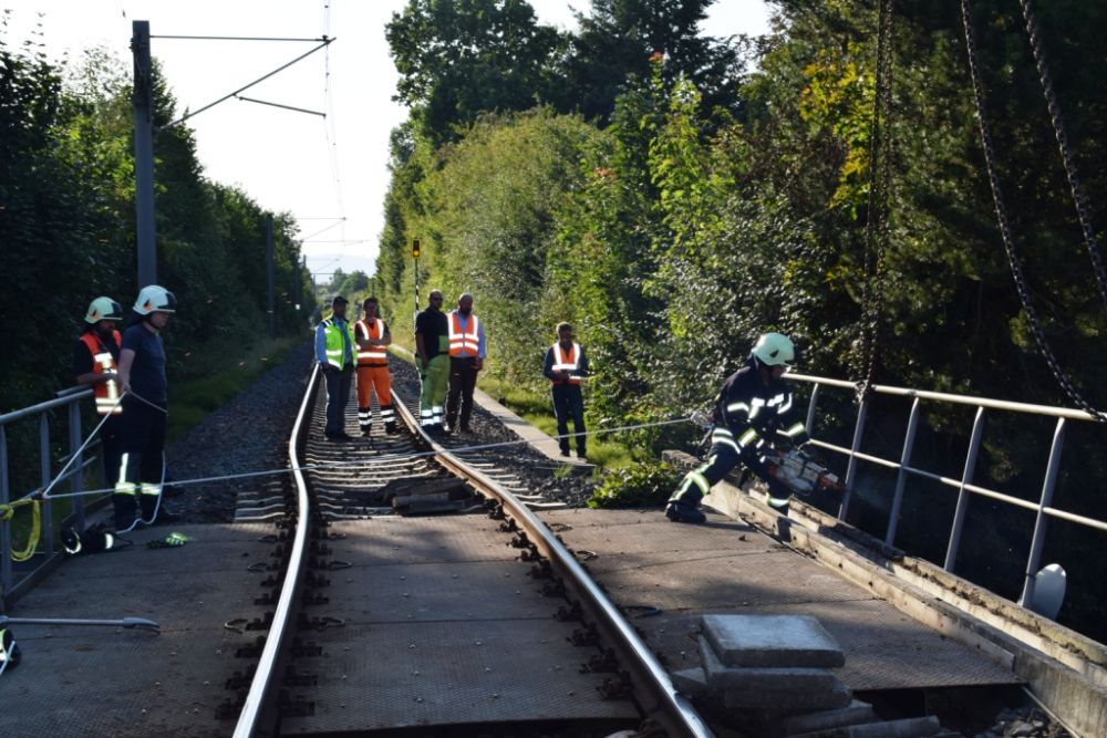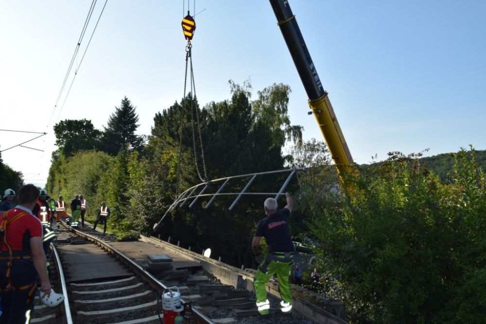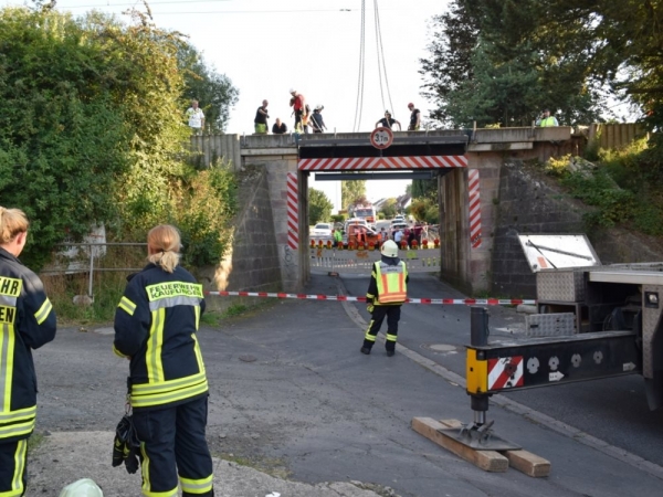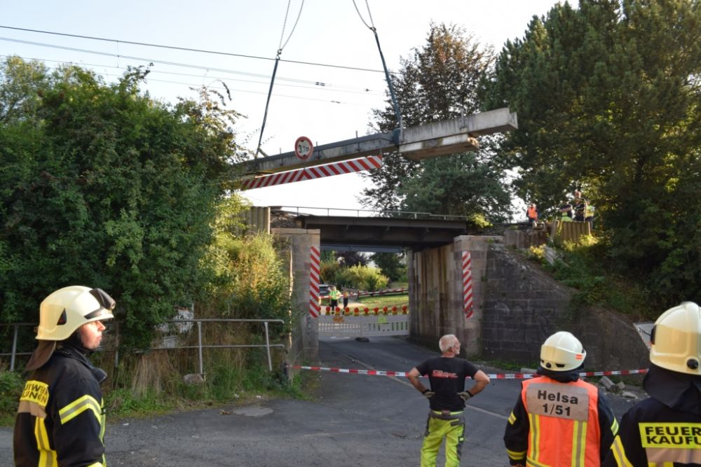 Noch während die Feuerwehr Kaufungen im Einsatz auf der B7 war, ging ein weiterer Einsatz ein. Im Ortsteil Niederkaufungen hatte ein LKW eine Brücke der Straßenbahngleise gerammt und dabei schwer beschädigt. Da der Rüstzug der Feuerwehr Kaufungen bereits im Einsatz war, wurde umgehend die Feuerwehr Helsa zur Unterstützung alarmiert. Vor Ort betreuten die Kaufunger und Helsaer Kameraden die Fahrgäste einer Straßenbahn, die aufgrund der starken Schäden an der Brücke diese nichtmehr passieren konnte, und sperrten den Bereich um die Brücke ab.